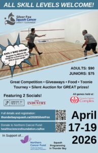 Any donations that would like to be made to the Silver Fox Squash Cancer tournament can be provided either through cheque or through e-transfer to silverfoxsquashcancer@gmail.com or by donating directly through the Northern Cancer Fund website: https://www.healthsciencesfoundation.ca/fox